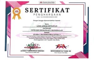 Selamat dan sukses kepada Azmi Azhar Setiawan atas prestasi luar biasa dalam Olimpiade Matematika dengan meraih Juara 1 yang dilaksanakan di 0. Semoga pencapaian ini menjadi langkah awal menuju prestasi-prestasi gemilang berikutnya dan terus menginspirasi untuk berjuang meraih yang terbaik.