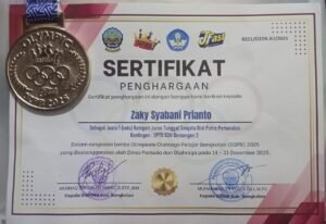 Selamat dan sukses kepada Zaky Syabani Prianto atas prestasi gemilang yang diraih dalam ajang perlombaan Pencak Silat pada Kategori Jurus Tunggal Sejata Dini dengan meraih Juara 1 yang dilaksanakan di GOR SAKA . Semoga keberhasilan ini menjadi motivasi untuk terus berlatih, berprestasi, dan mengharumkan nama sekolah.